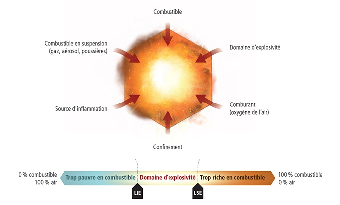 An atmosphere becomes explosive as soon as the parameters (explosive range, temperature, etc.) are met to initiate combustion in the presence of three components: an oxidant (oxygen, for example), a fuel (gas and/or dust) and a source of ignition (a flame, for example) ».